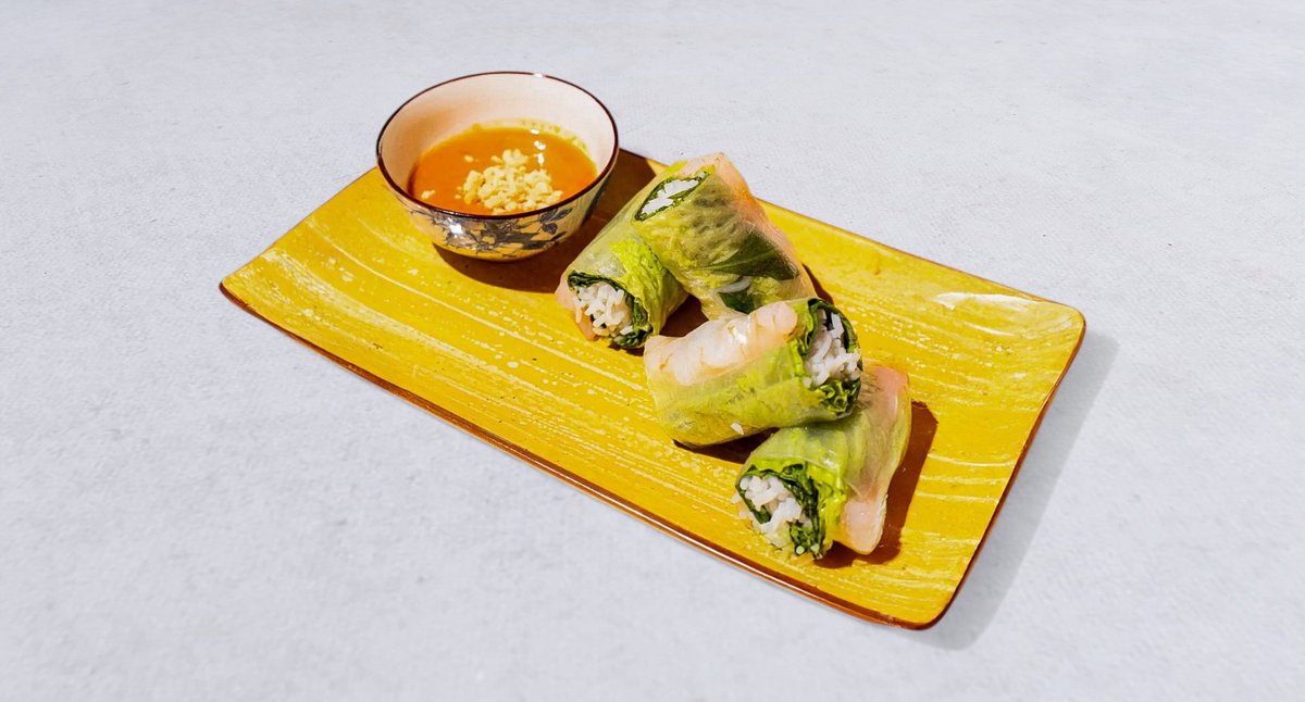 4 szt. Ciasto ryżowe z warzywami - marchewka, ogórek, cebula, i pachnącymi ziołami i serwowane na zimno. Podawane z sosem orzechowym