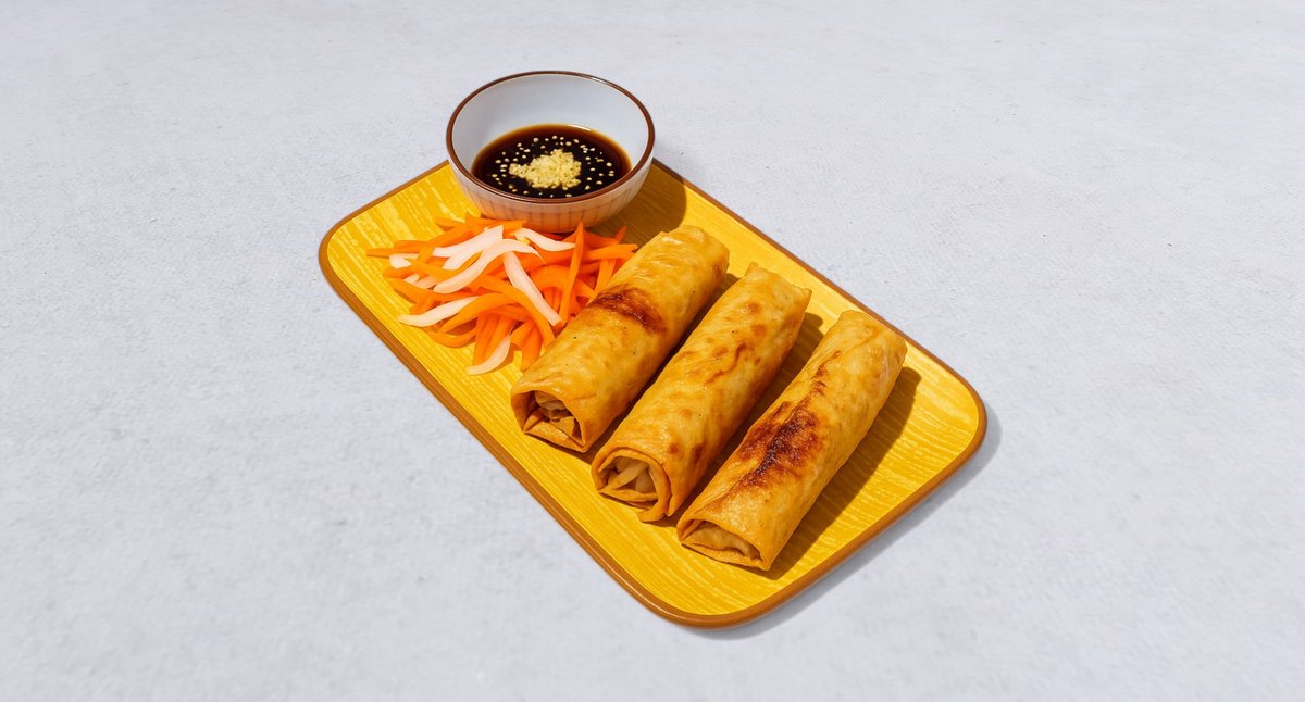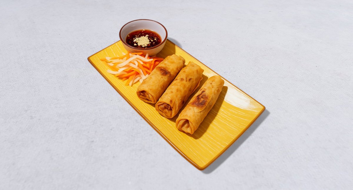 3 szt. Smażone sajgonki z nitkami ryżowymi i pachnącymi ziołami podawane ze słodko-pikantnym sosem oraz marynowaną rzodkiewką i marchewką
