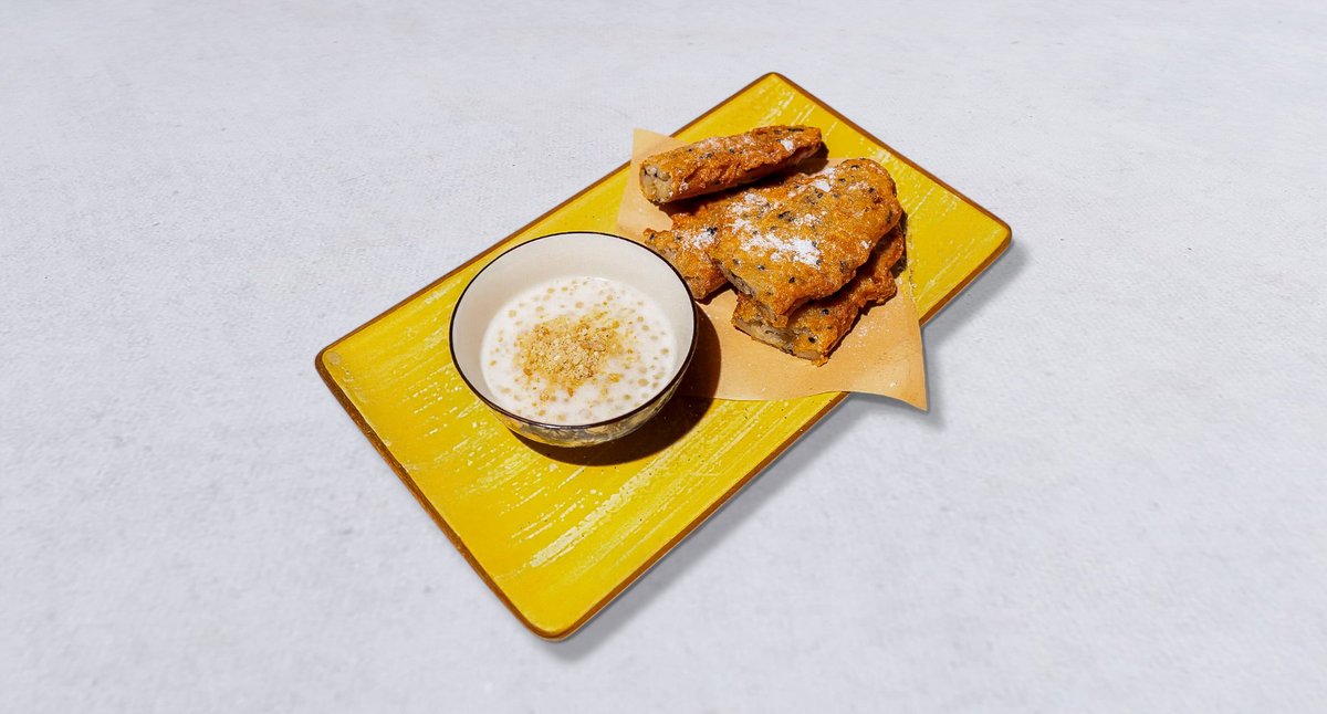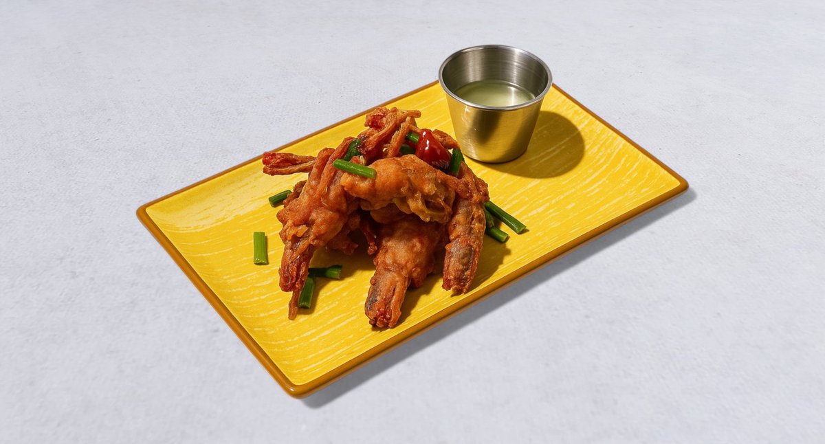 5 szt. Delikatnie smażone w tempurze, podawane z częściowo odłączonym pancerzem dla wygody i efektownej prezentacji podawane z autorskim sosem bazyliowym