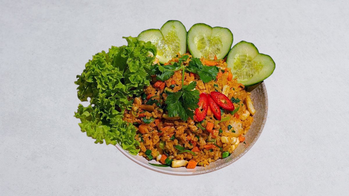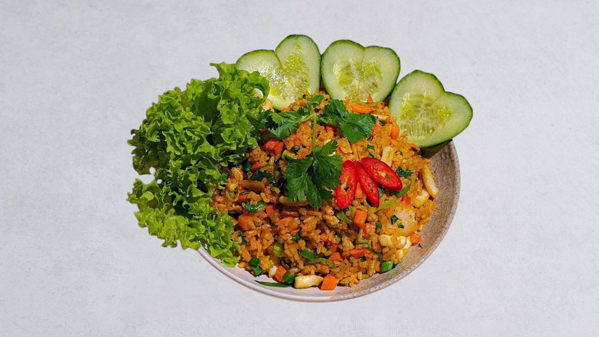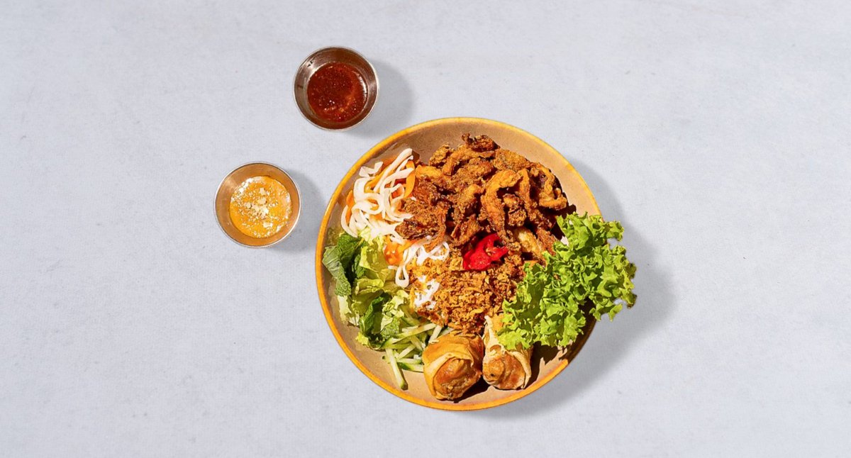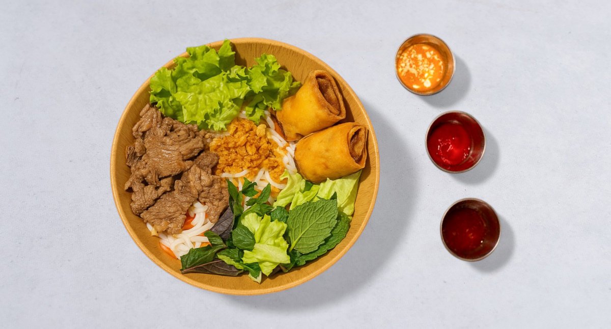 Makaron ryżowy, świeże zioła, chrupiące warzywa - marchewka, ogórek, cebula, sajgonki warzywne i wybrany dodatek i podane z domowym sosem nuoc cham - sos na bazie sosu rybnego