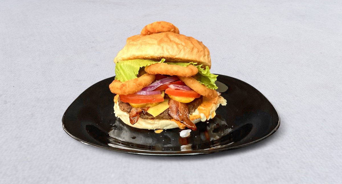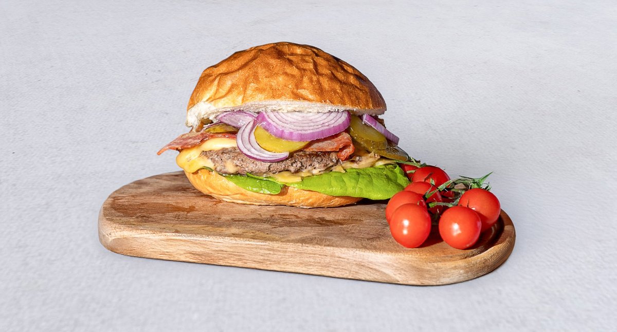 Kotlet 100% wołowy 200 g, krążki cebulowe, ser cheedar, pikle, bekon, warzywa, dwa sosy wyboru