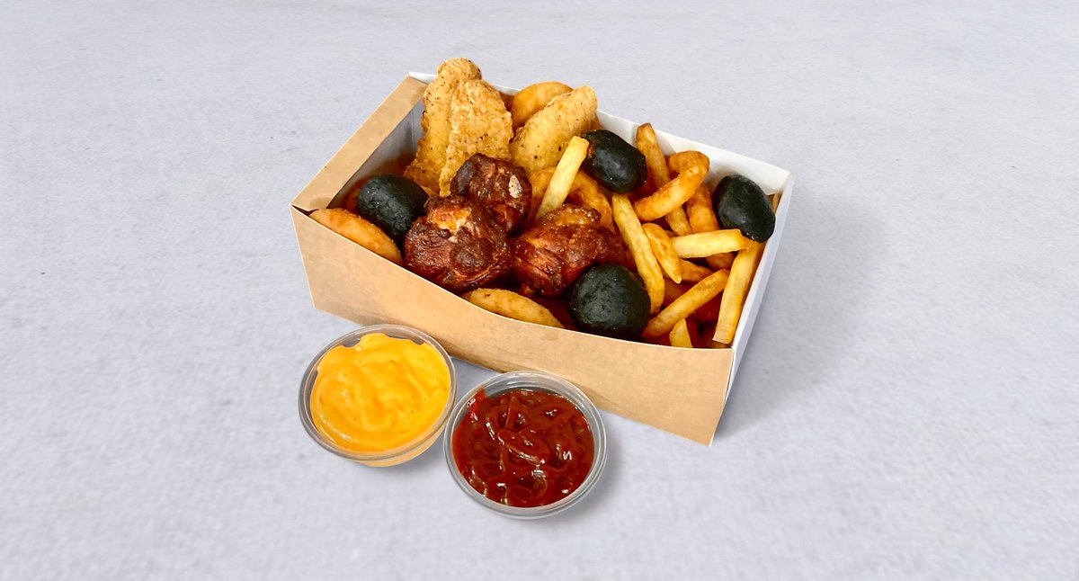 Pikantne udka z kurczaka, polędwiczki z kurczaka, czarne kulki serowe, krążki cebulowe, frytki, dwa sosy do wyboru