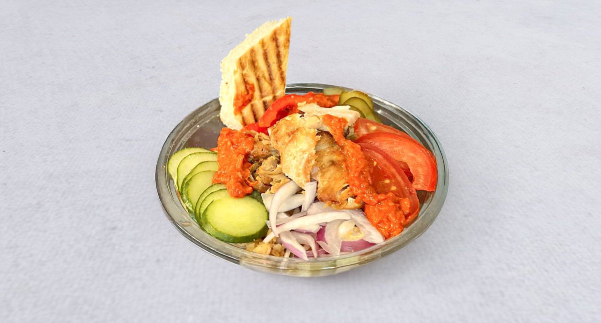 Kurczak, sałata lodowa, papryka, pomidor, ogórek, ser typu feta, oliwki, pieczywo, sos tzatziki