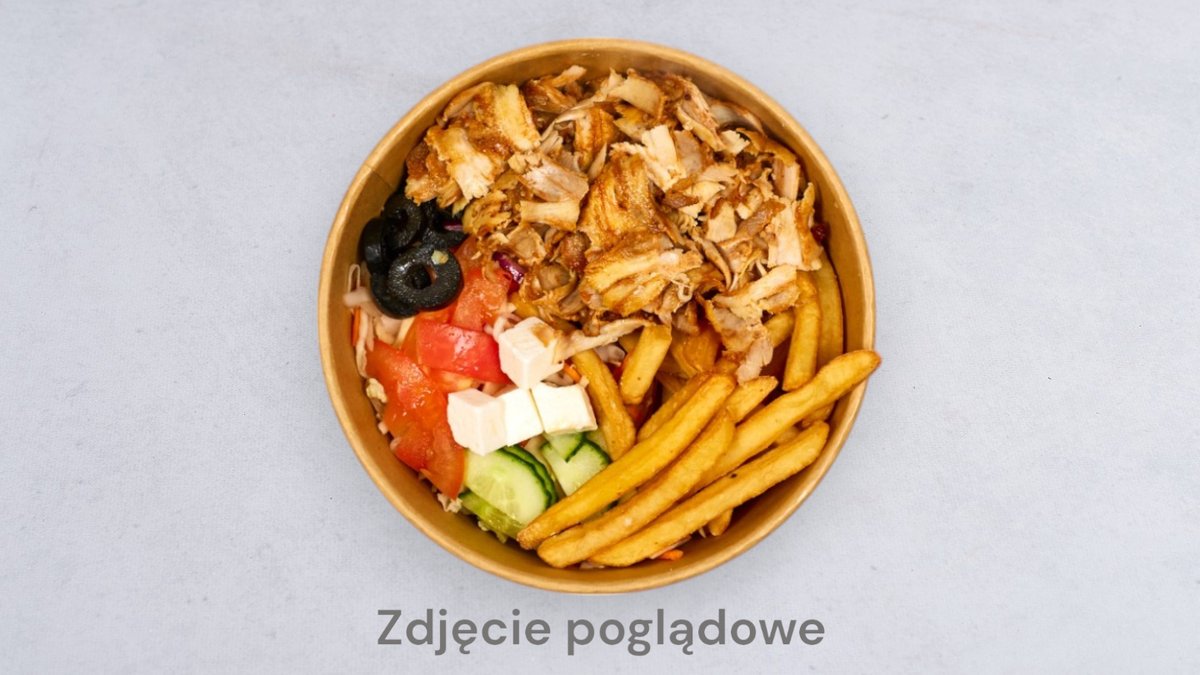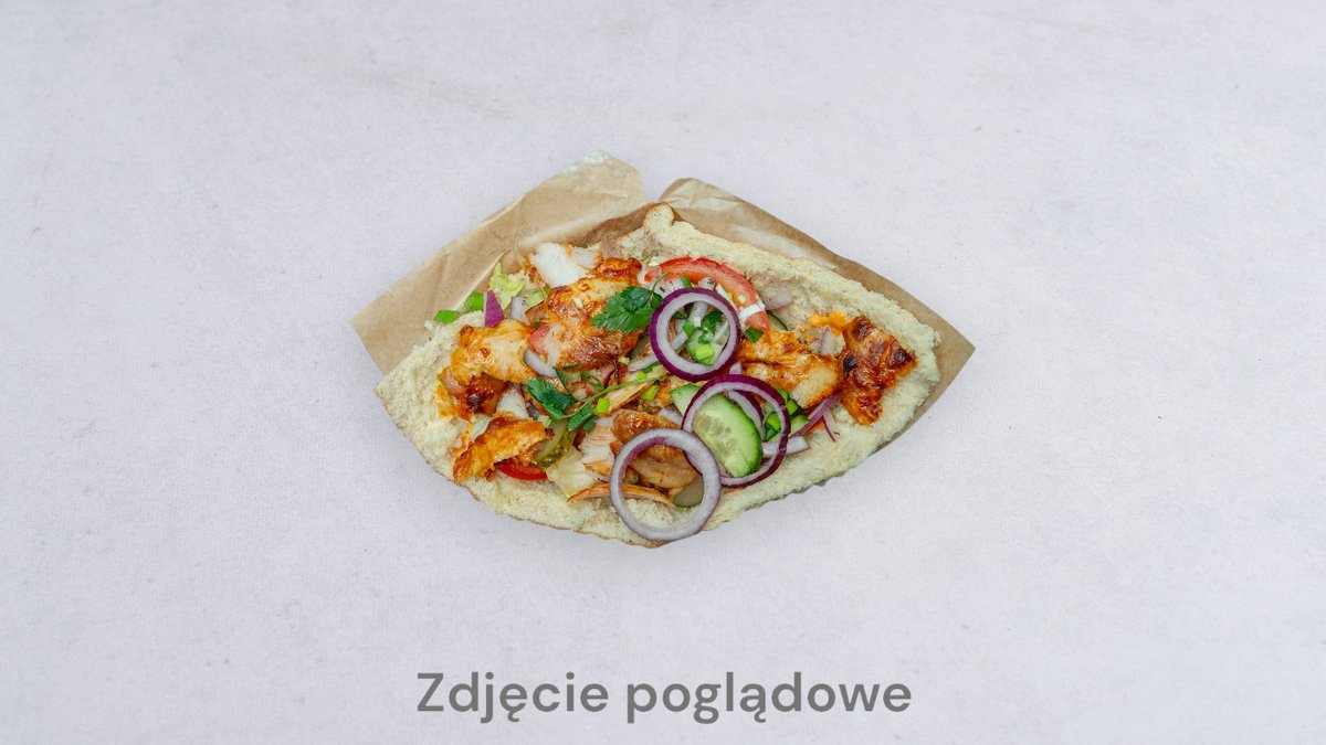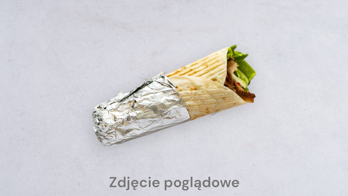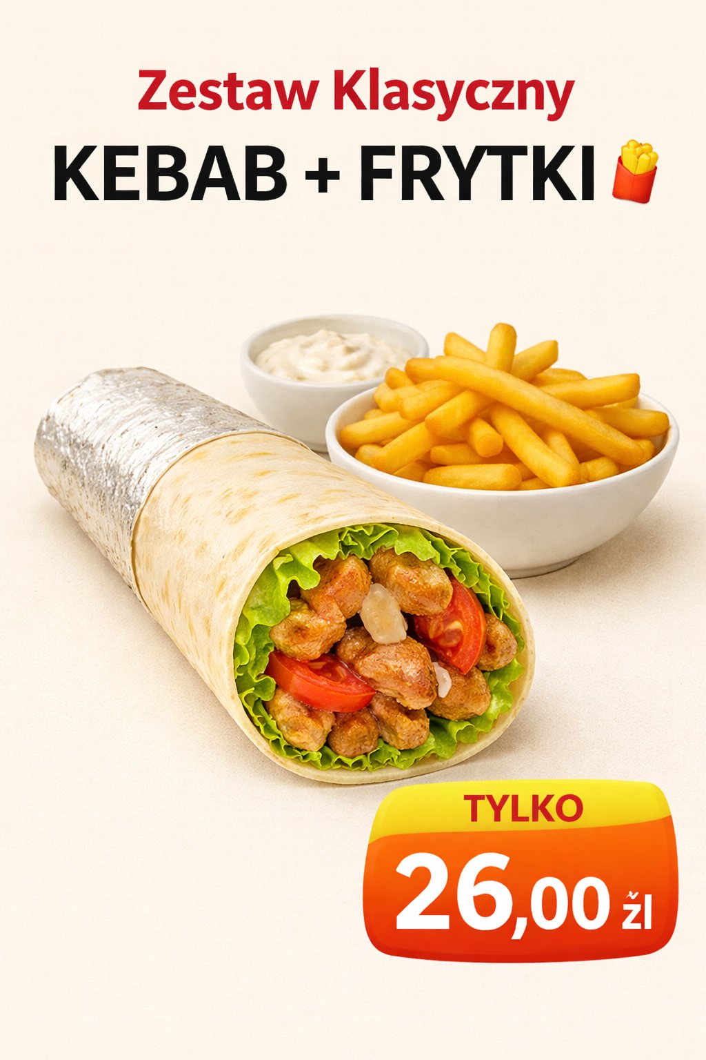 Kebab klasyczny w tortilli z soczystym mięsem, świeżymi warzywami i wybranym sosem. Podawany z porcją chrupiących frytek. Idealny zestaw na szybki i sycący posiłek.