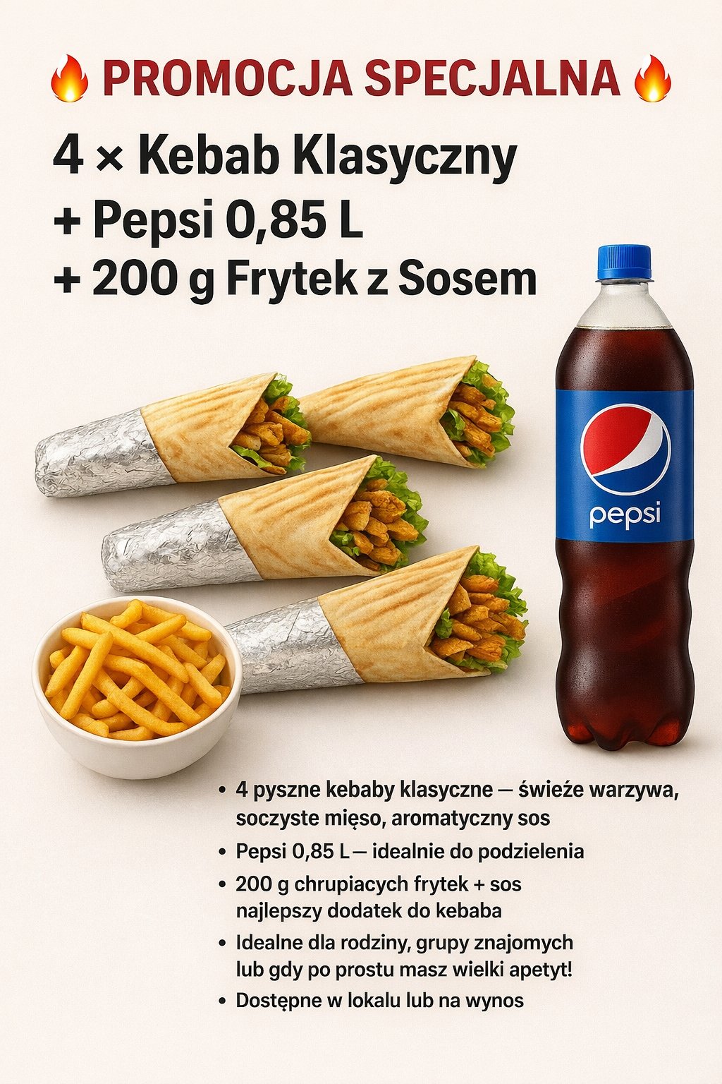 4× Kebab klasyczny + Pepsi 0,85 l + 200 g frytek z sosem. Idealne dla rodziny lub grupy znajomych.