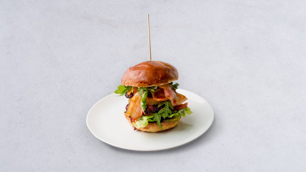 Wołowina 250 g., cheddar, camembert, maliny, bekon, cebula karmelizowana, rukola, pomidor, ogórki konserwowe, czerwona cebula, sos żurawinowy, sos burgerowy