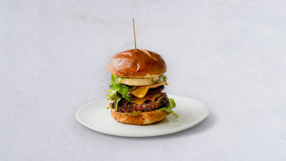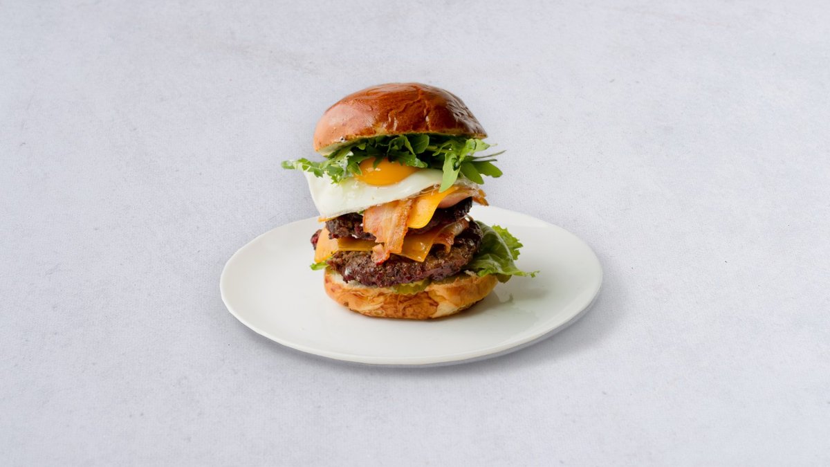 Wołowina 250 g., jajko sadzone, cheddar, bekon, cebula karmelizowana, sałata, pomidor, ogórki konserwowe, czerwona cebula, sos Cola-BBQ, sos jabłkowy