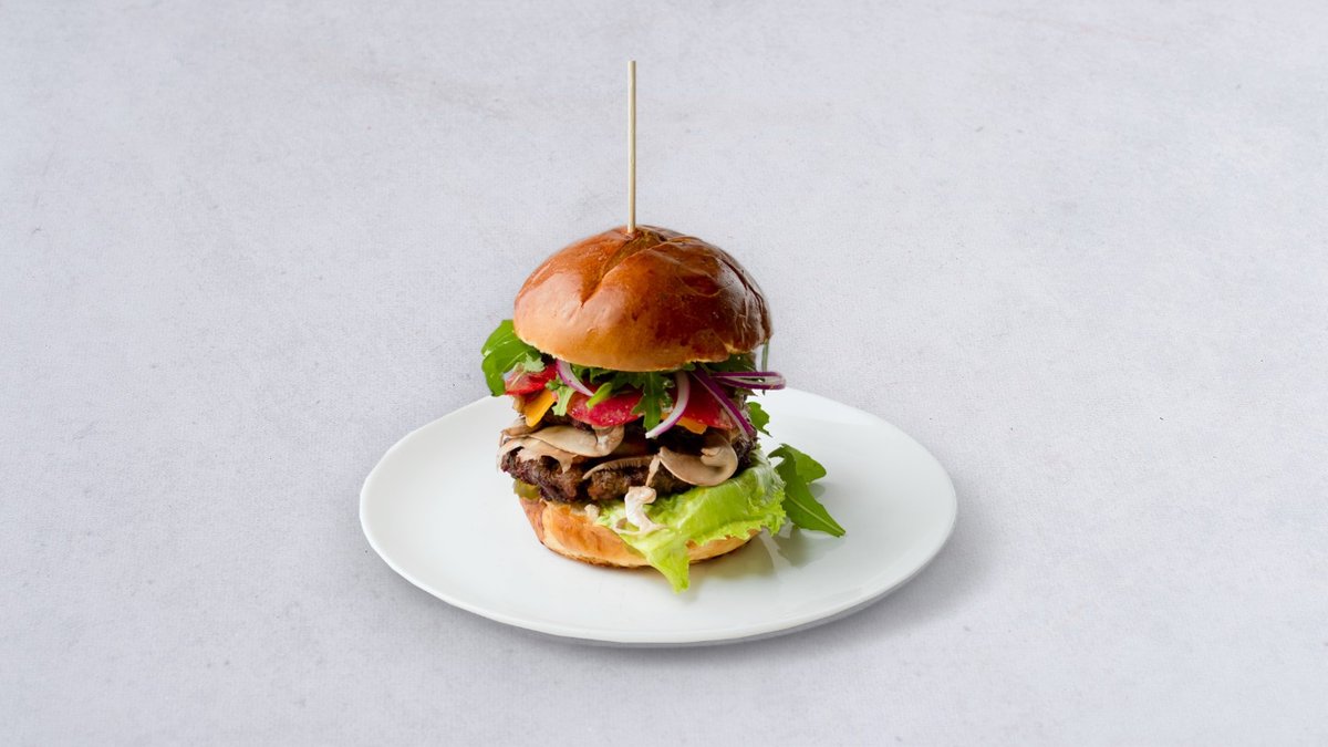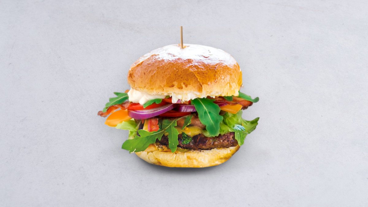 Wołowina 250 g., cheddar, bekon, pepperoni, salami, pieczarki, cebula karmelizowana, sałata, pomidor, ogórki konserwowe, czerwona cebula, sos Cola-BBQ, sos burgerowy