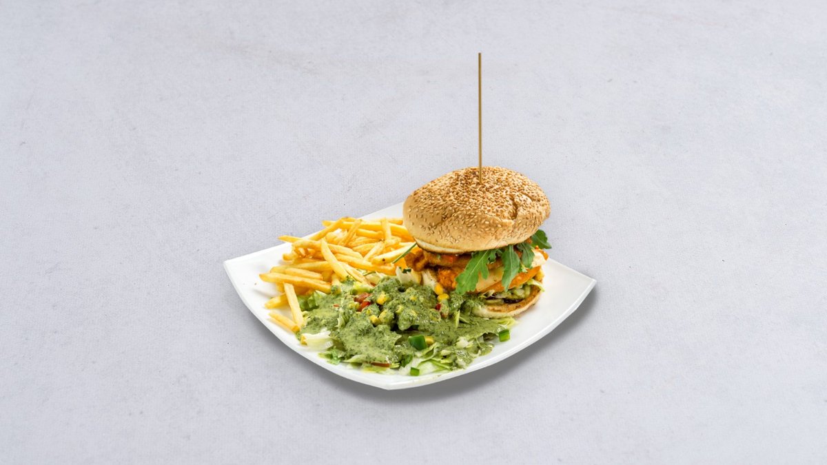 Drób, cebula karmelizowana, sałata, pomidor, ogórki konserwowe, czerwona cebula, sos burgerowy, sos Cola-BBQ