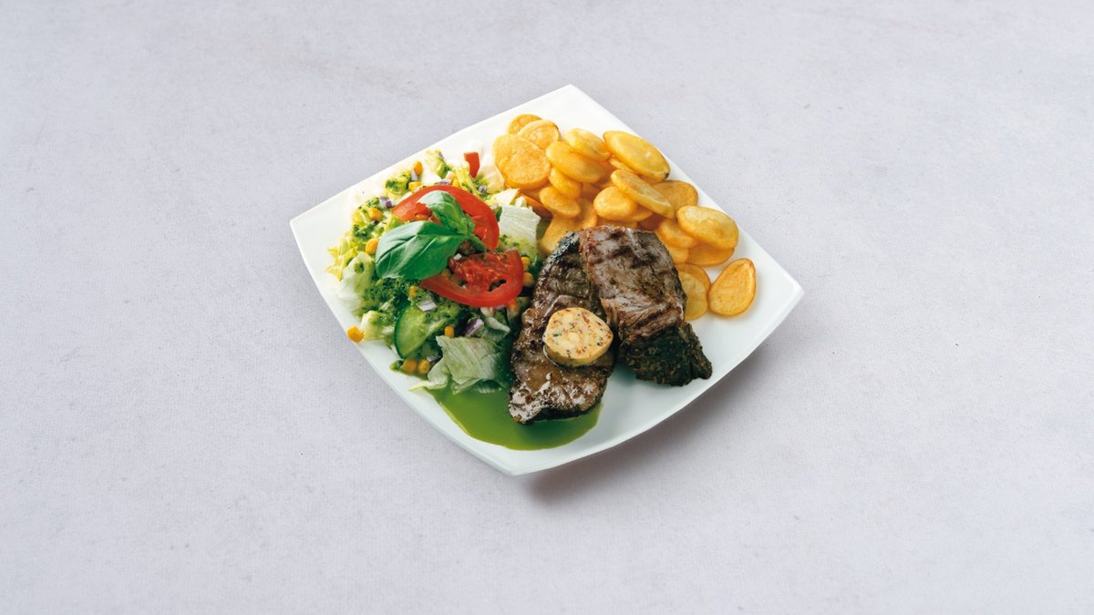 Wołowina 250 g., placek ziemniaczany, kiełbasa podlaska, koryciński ser wędzony, boczek, cebula karmelizowana, sałata, pomidor, ogórki konserwowe, czerwona cebula, sos żurawinowy, sos Cola-BBQ