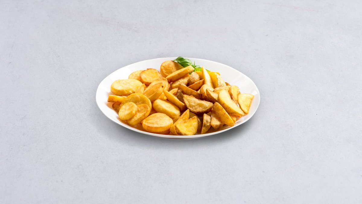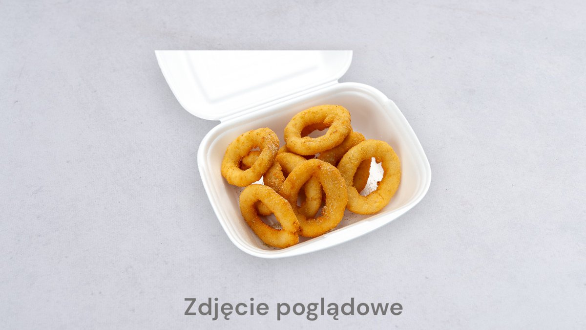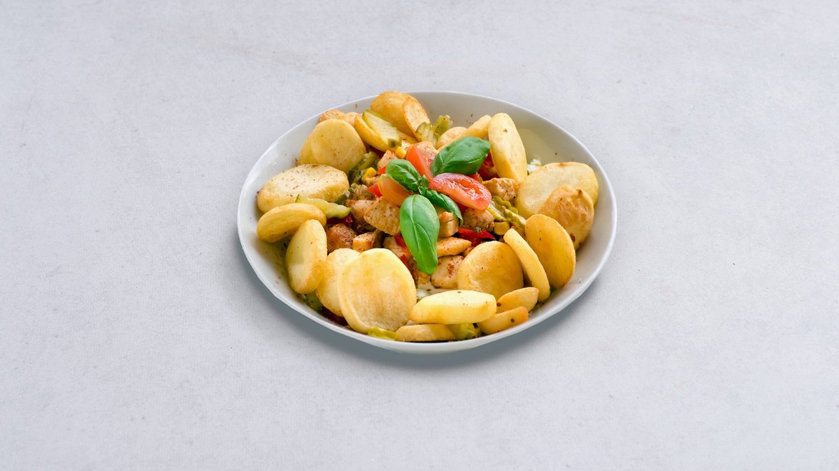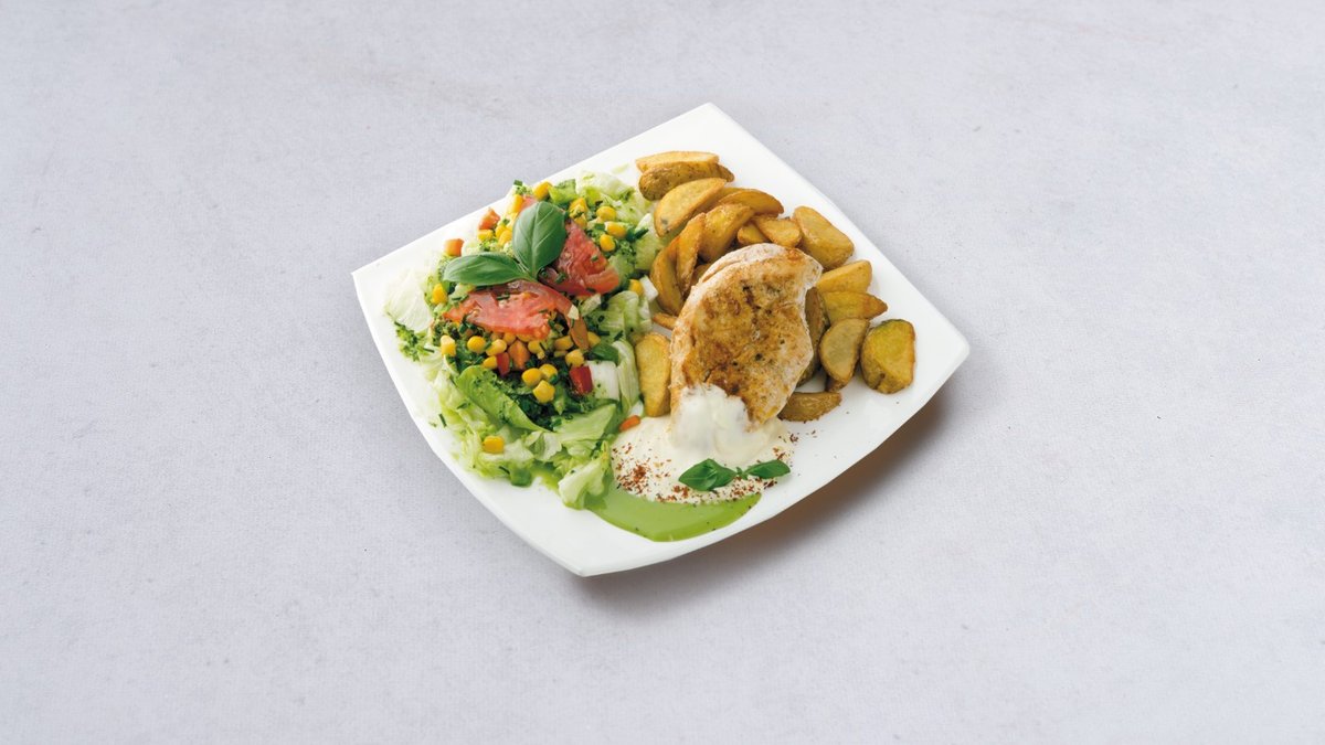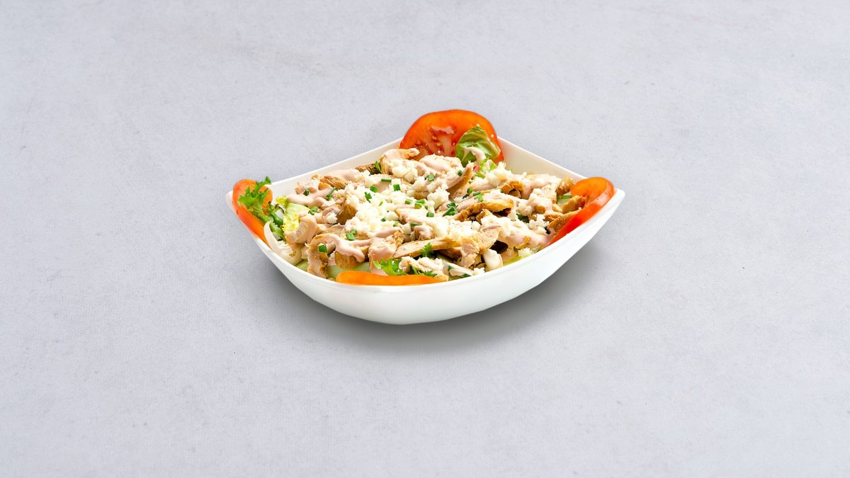 Sałata lodowa, kurczak, pomidory koktajlowe, ogórek konserwowy, kukurydza, papryka, cebula, talarki ziemniaczane, sos jogurtowo-czosnkowy