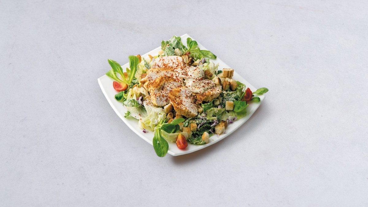 Mix sałat, grillowany kurczak, cebula czerwona, grzanki ziołowe, parmezan z dodatkiem sosu cezar