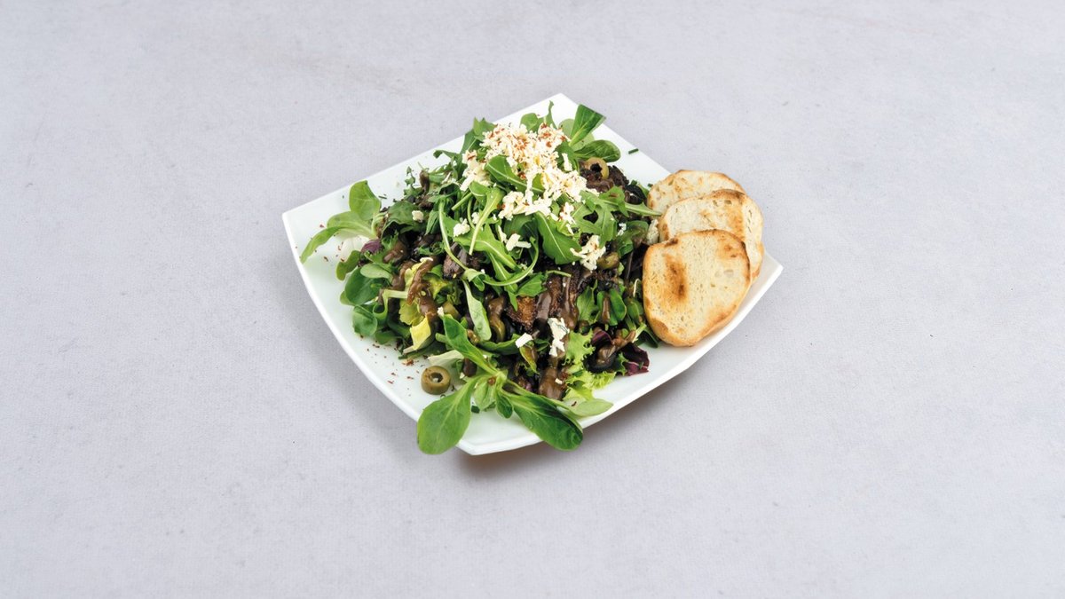 Mix sałat, wątróbki drobiowe obsmażane na klarowanym maśle, podawane z rukolą i oliwkami, obsypane serem pleśniowym rokpol, z sosem na bazie octu balsamicznego i oliwy z oliwek