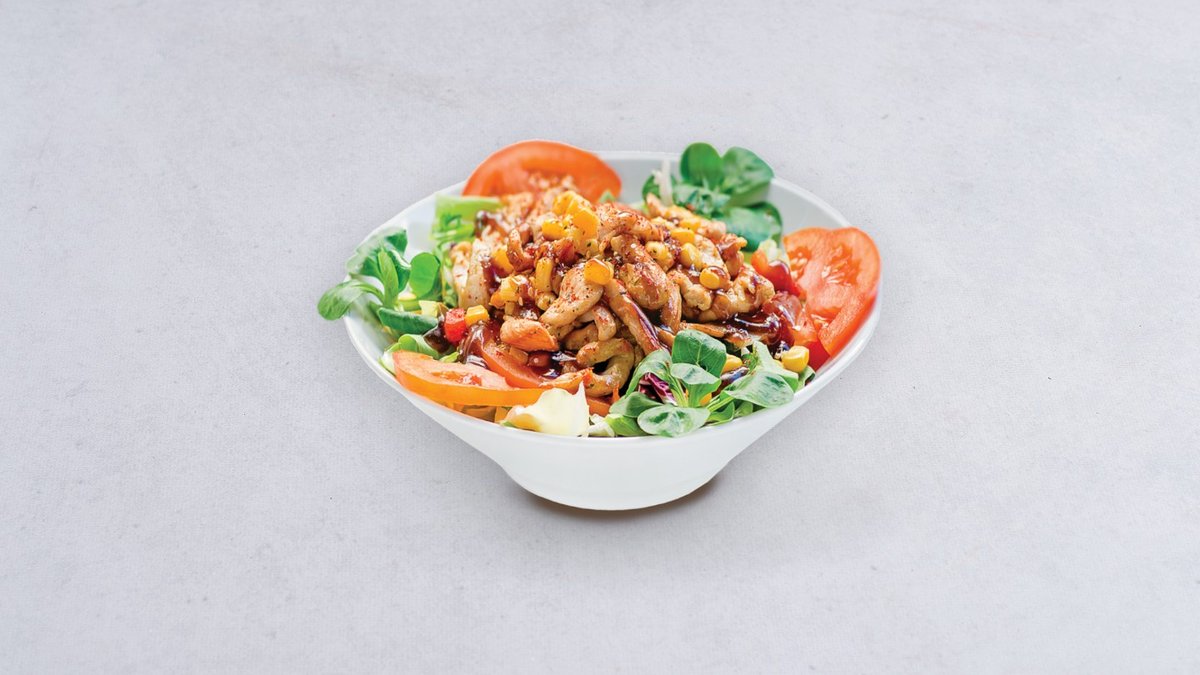 Mix sałat, kurczak, pomidor, ogórek, papryka, kukurydza, cebula z dodatkiem sosu firmowego