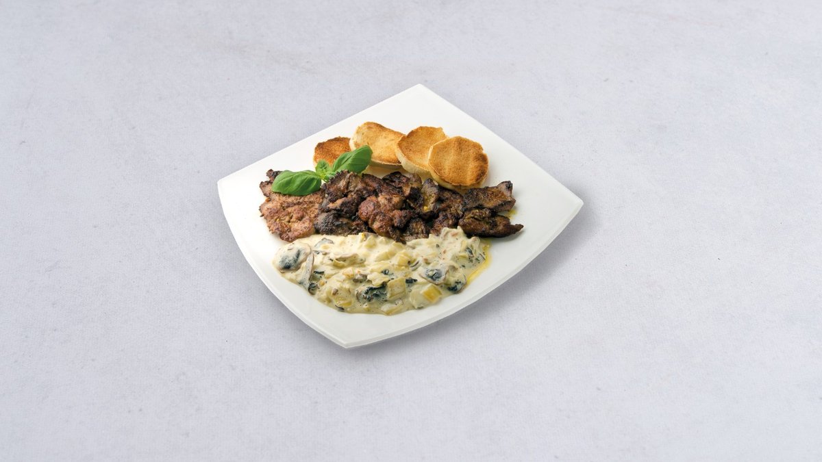 W sosie śmietanowym z cebulką, jabłkiem i pieczarkami, podawana z opiekanym pieczywem czosnkowym