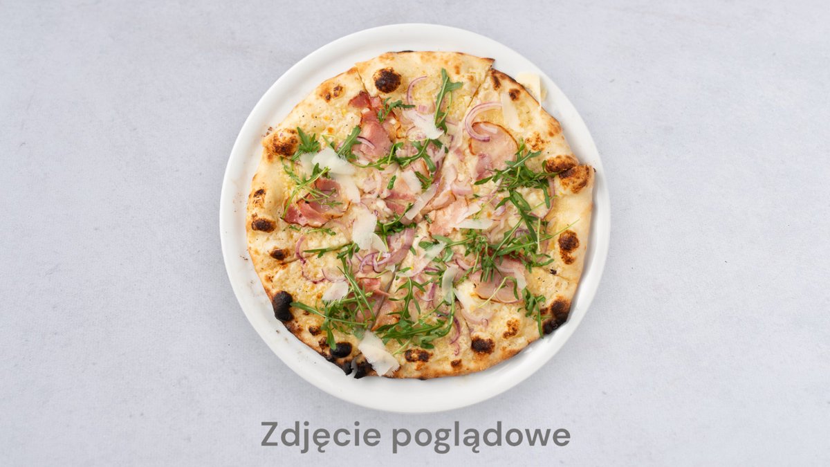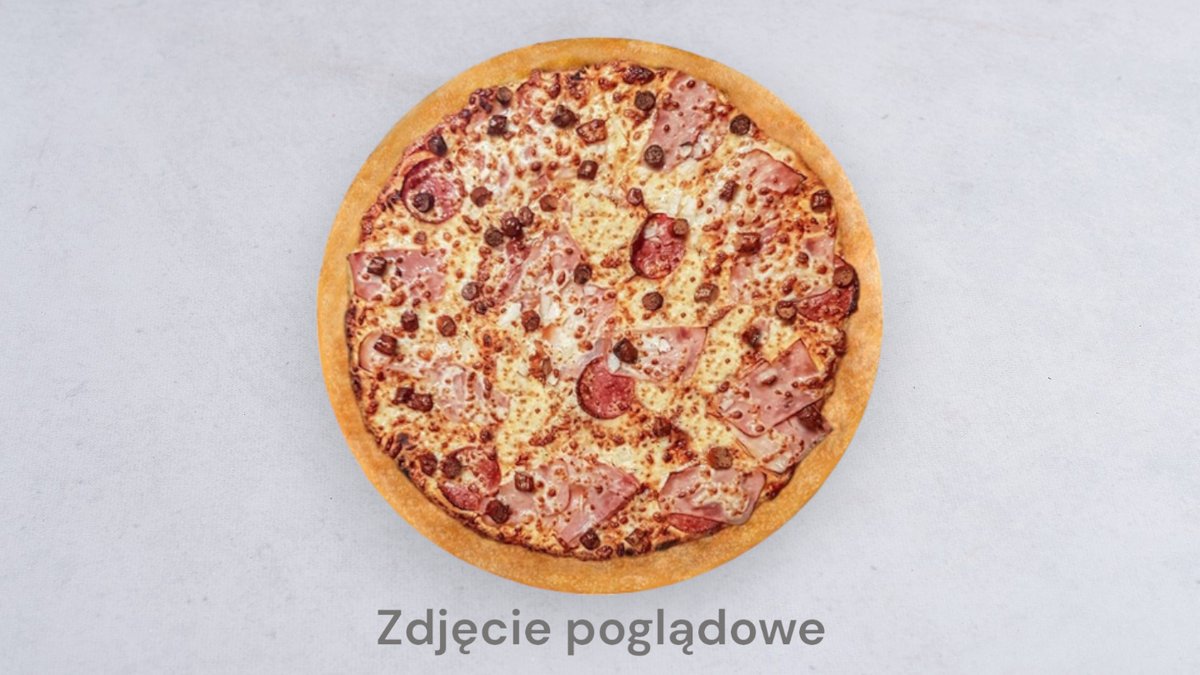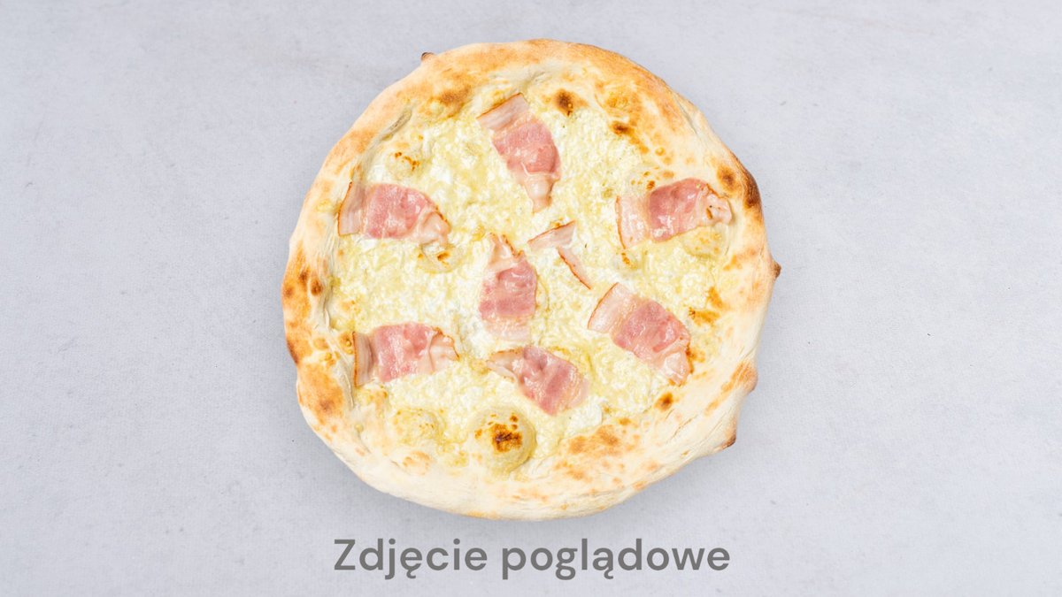 Z szynką, boczkiem, pieczarkami, cebulą i sosem serowo-śmietanowym