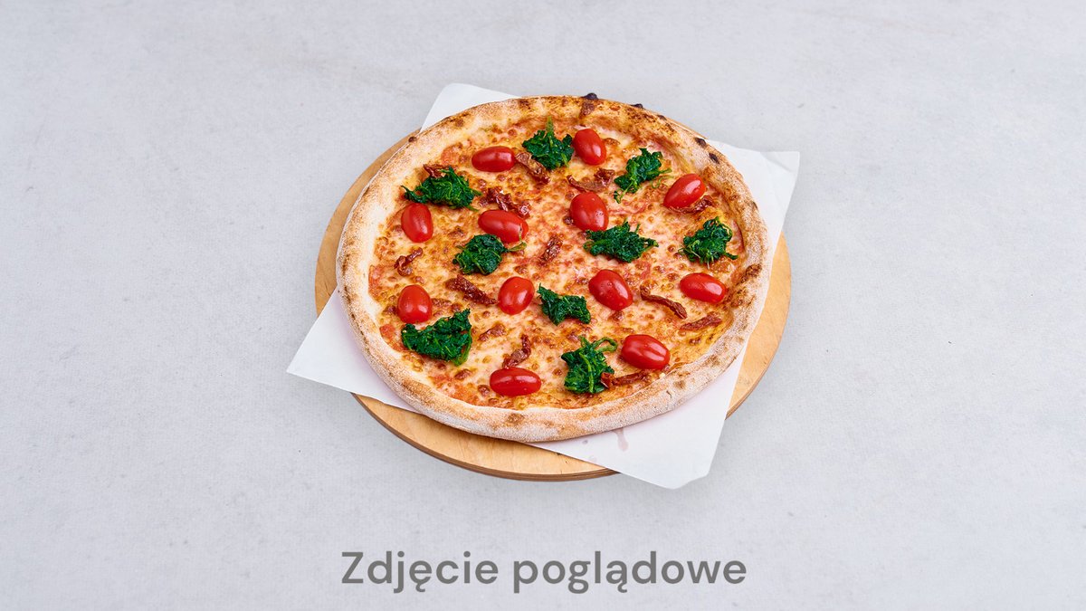 Z serem wegańskim, pieczarkami, papryką, oliwkami, pomidorkami suszonymi, sosem czosnkowym