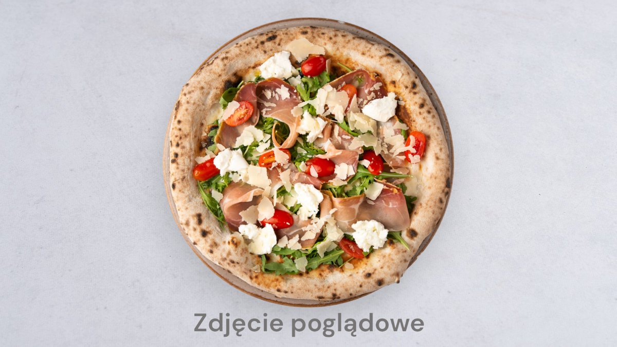Z pomidorami koktajlowymi, szynką parmeńską, rukolą i parmezanem