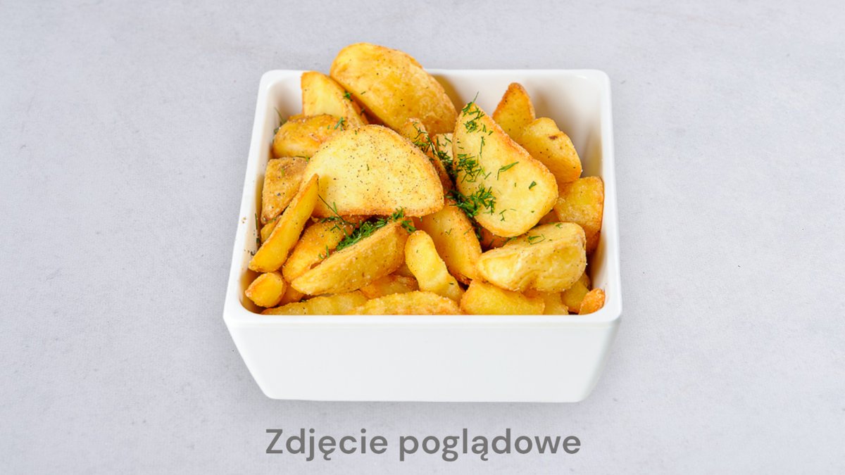 Podawana z sosem serowym, ziemniakami opiekanymi i surówką
