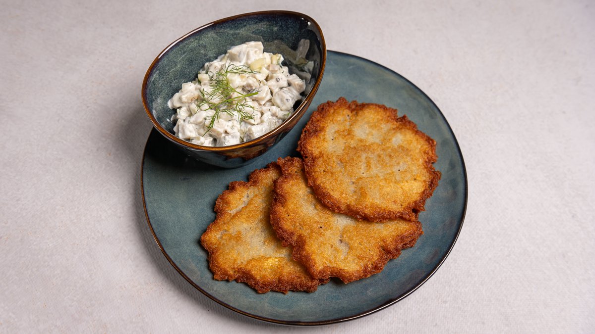 Placki ziemniaczane 3 sztuki, śledź w śmietanie