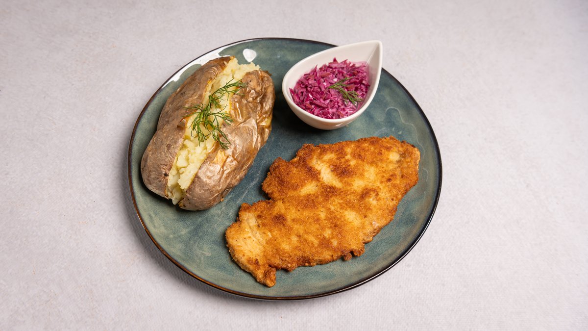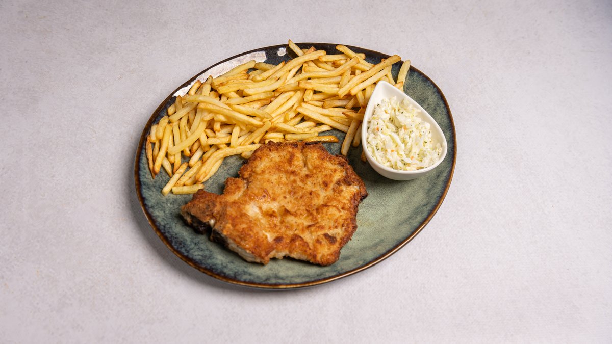 200 g Schabowy z kością z pieczonymi ziemniakami lub frytkami i surówką z warzyw sezonowych