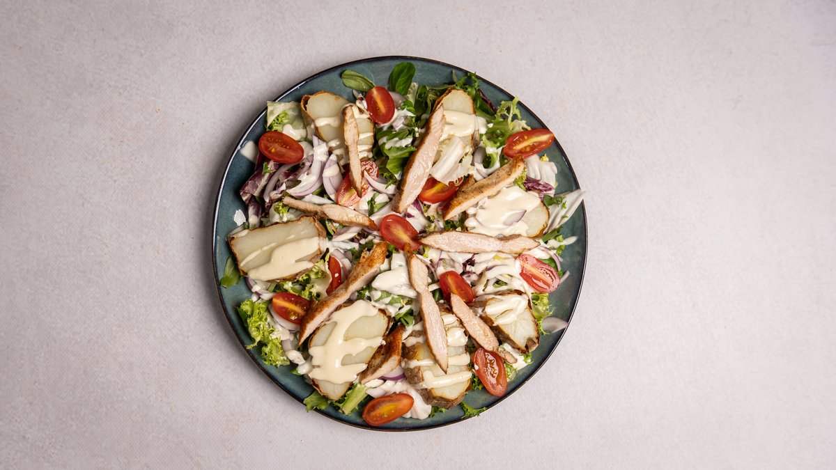 Mix sałat, kurczak, ziemniaki, pomidorki koktajlowe, cebula czerwona, sos czosnkowy