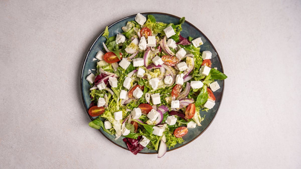 Mix sałat, ser kozi, pomidorki koktajlowe, cebula czerwona, winegret pietruszkowy