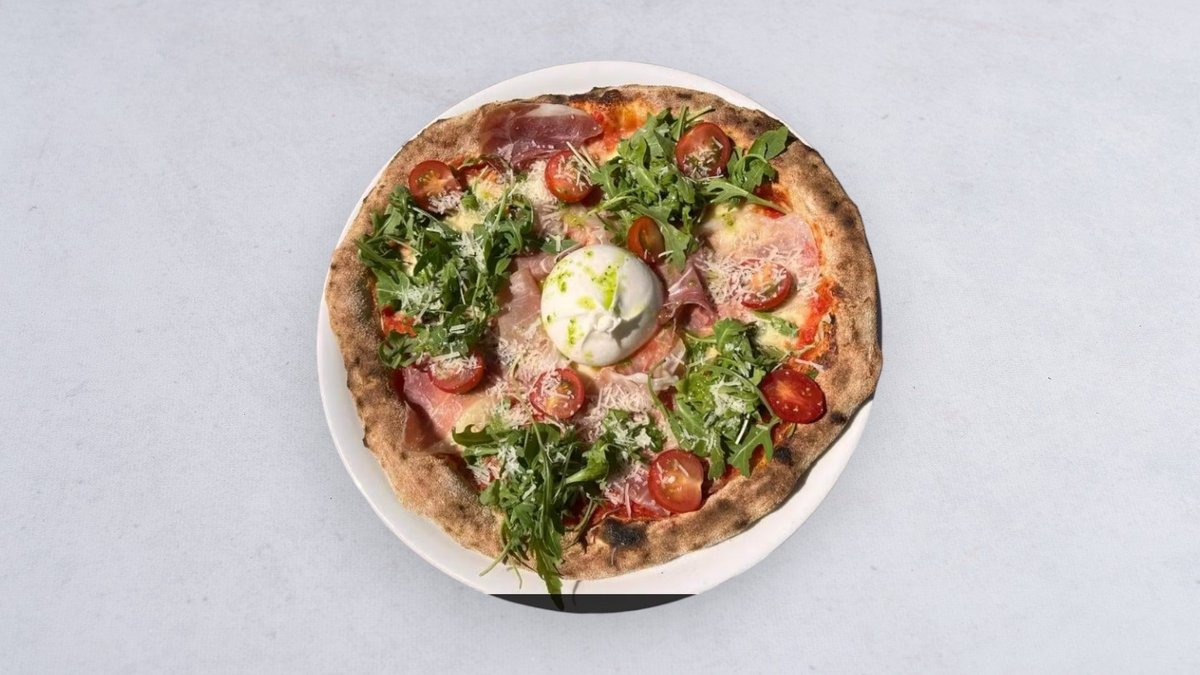 Z sosem pomidorowym, rukolą, szynką crudo dojrzewającą, pomidorkami koktajlowymi, burratą, parmezanem i czosnkową oliwą ziołową