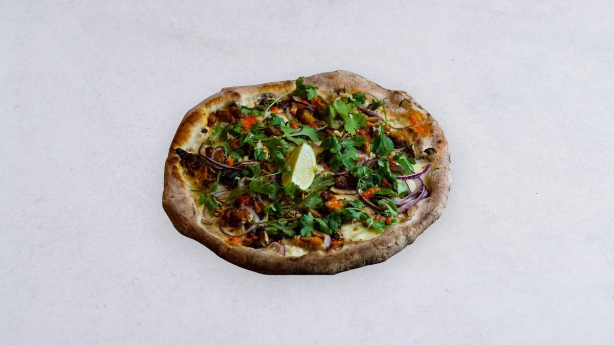 Z mozzarellą, mleczkiem kokosowym, kurczakiem, pieczarkami, cebulą, imbirem, ostą oliwą z papryczkami i kolendrą