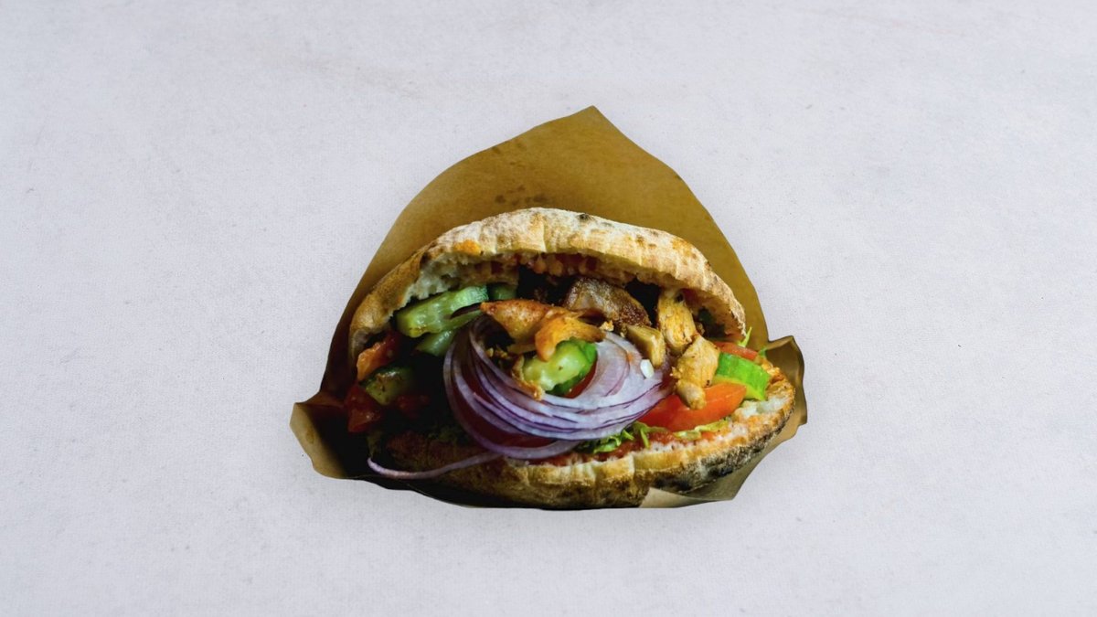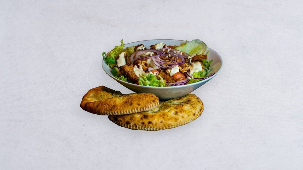 Miks sałat, ogórek, pomidor, czerwona cebula, kurczak, sos czosnkowy