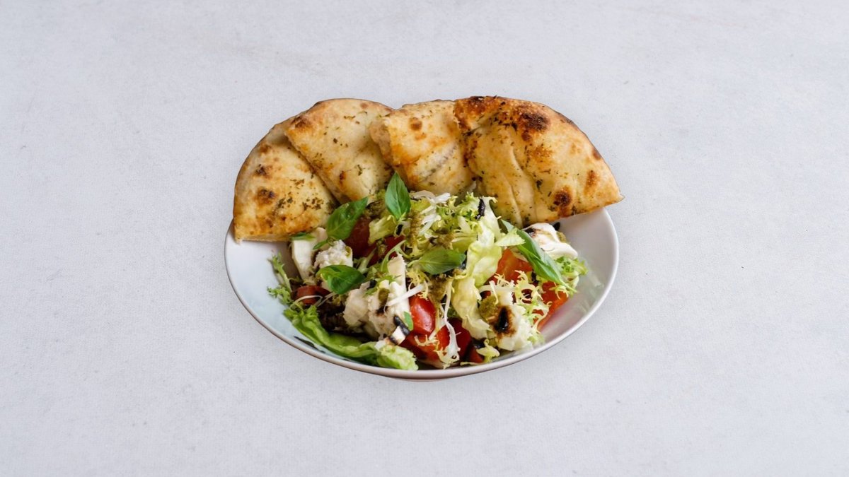 Miks sałat, rukola, pomidor, oliwa, cytryna, burrata, pesto bazyliowe, ocet balsamiczny