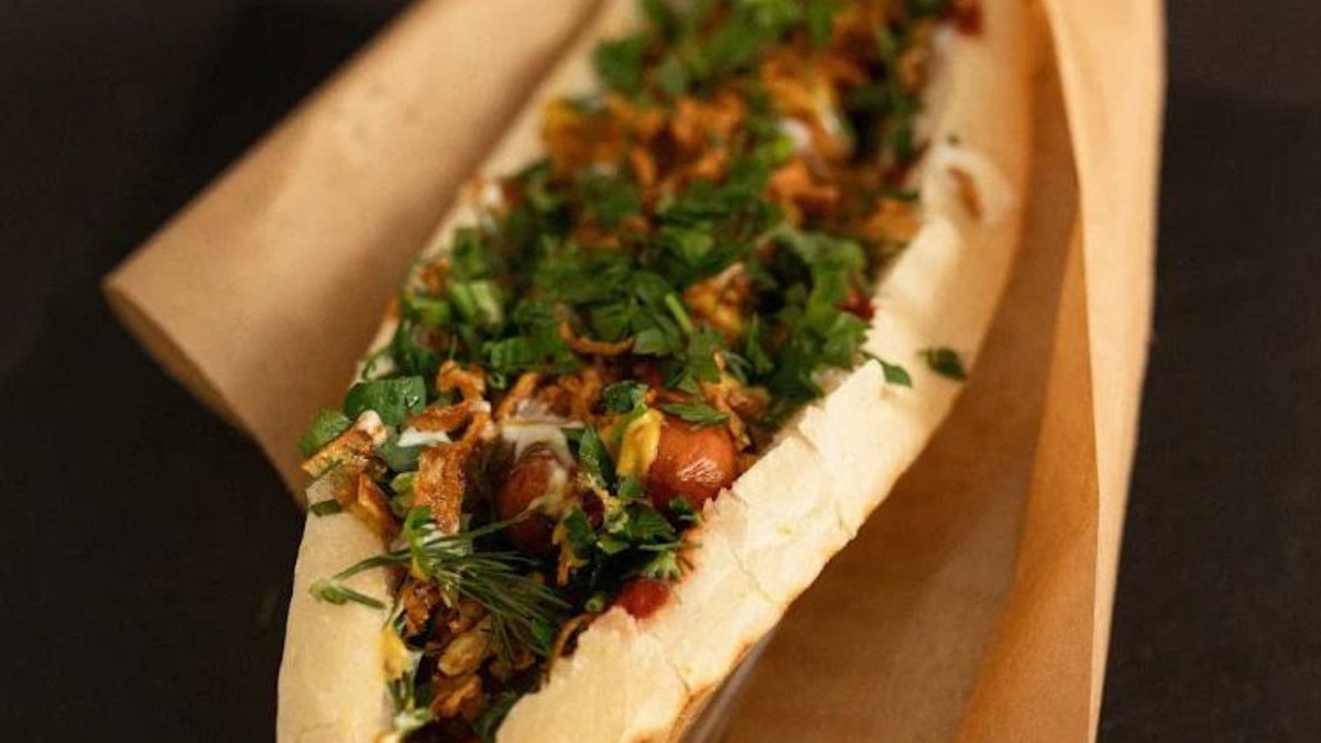 Bułka, firmowe sosy czosnkowy i pomidorowy, parówka lub frankfurterka, marchewka po koreańsku, ogórek konserwowy, pietruszka, koperek, cebula marynowana, prażona cebulka, musztarda