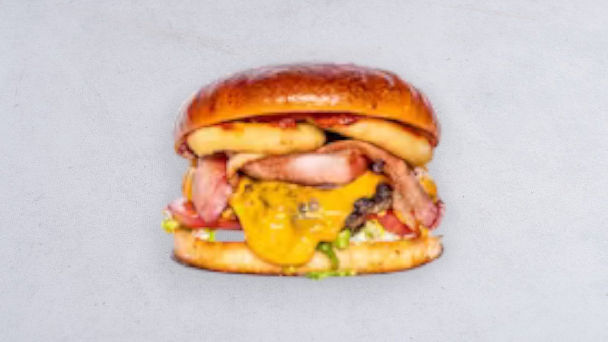 Wołowina, cheddar, boczek, sałata rzymska, pomidor, ogórek kiszony, krążki cebulowe, sos BBQ, sos śmietankowy