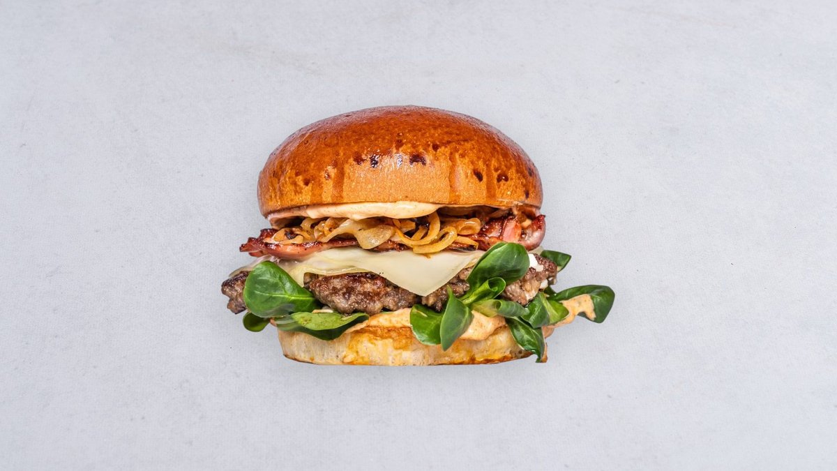 Wołowina, ser edamski, roszponka, boczek, cebula biała smażona, sekretny sos