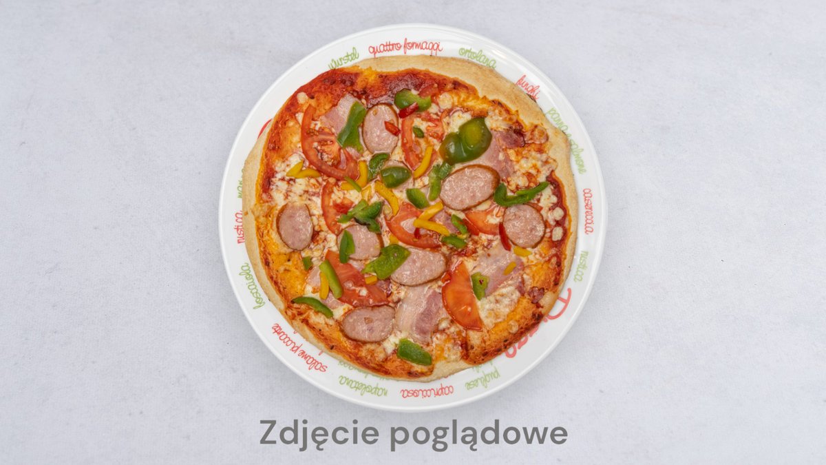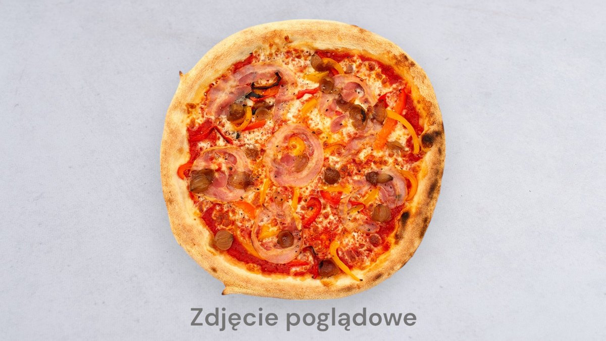 Sos pomidorowy, ser, oregano, salami pepperoni, boczek, cebula.