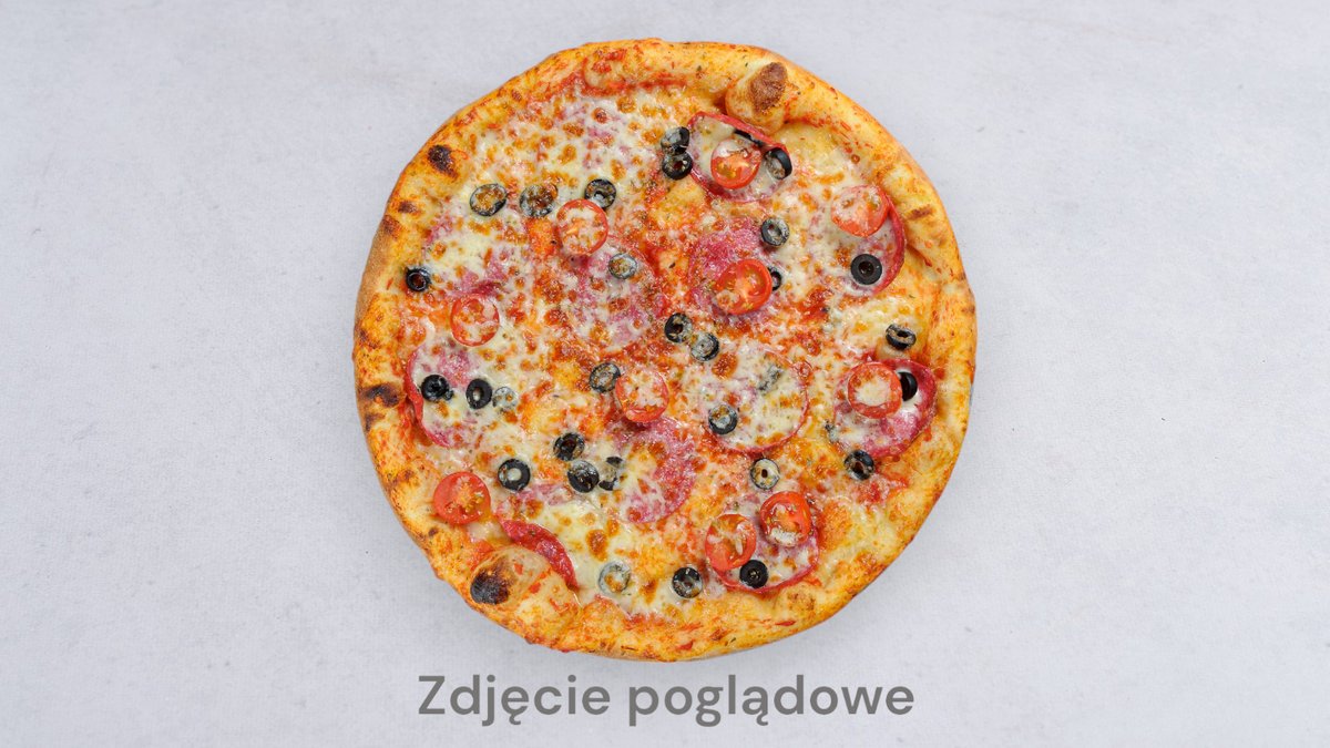 Sos pomidorowy, ser, salami pepperoni, szynka, oliwki, papryka
