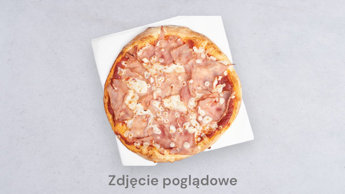 Sos pomidorowy, ser, oregano, szynka, pieczarki.