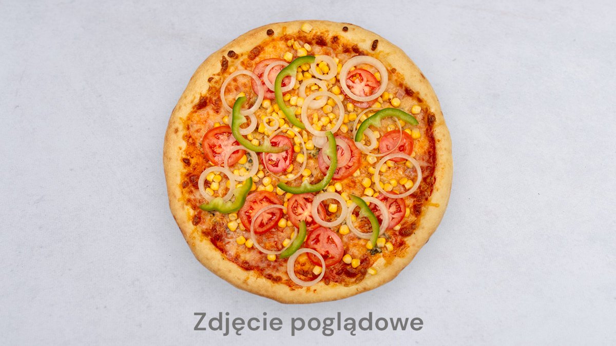 Sos pomidorowy, ser, oregano, pieczarki, cebula, oliwki, papryka, brokuł, kukurydza