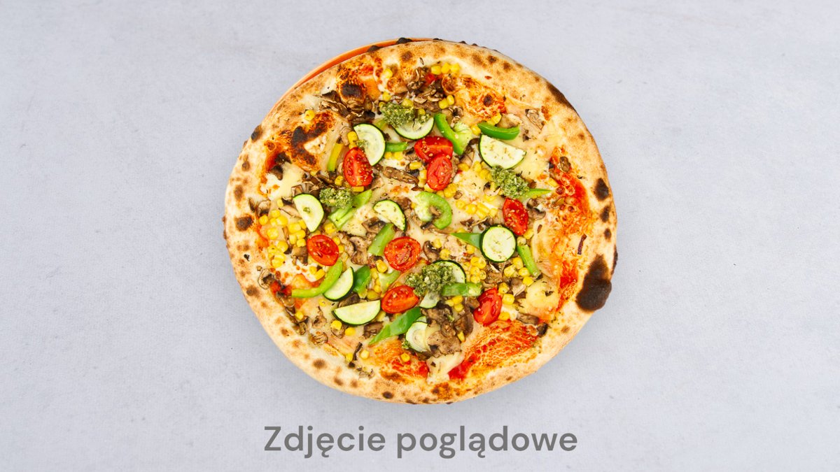 Sos pomidorowy, ser, pieczarki, cebula, oliwki, papryka, brokuł, kukurydza