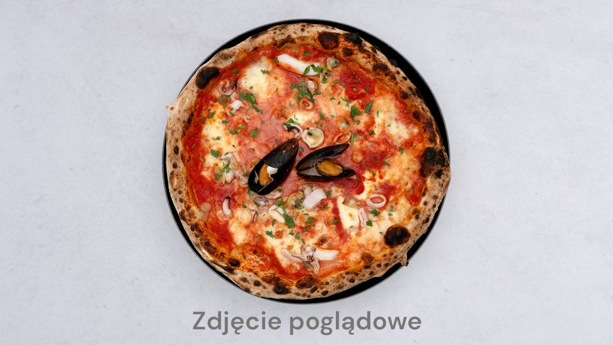 Sos pomidorowy, ser, pieczarki, salami pepperoni, cebula, małże, czosnek