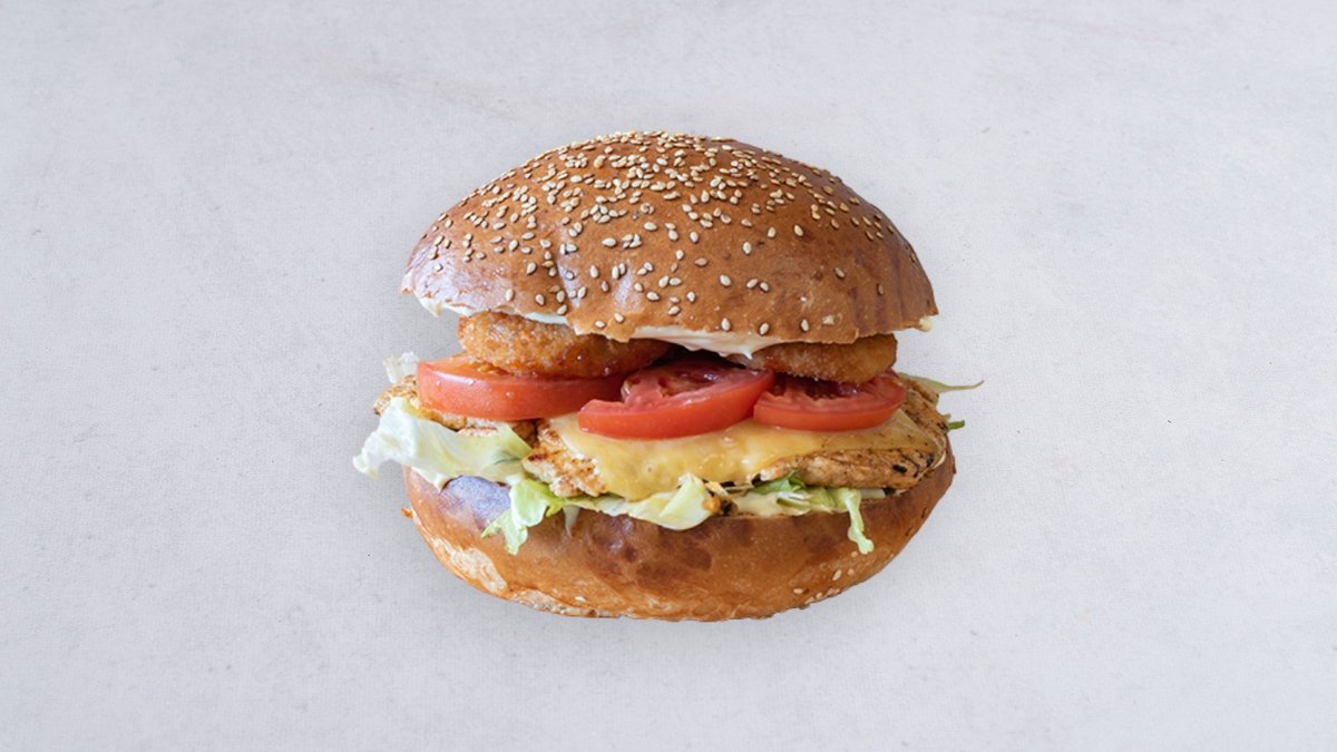 Pierś z kurczaka, krążki cebulowe, ser cheddar, pomidor, sałata, sos majonezowy