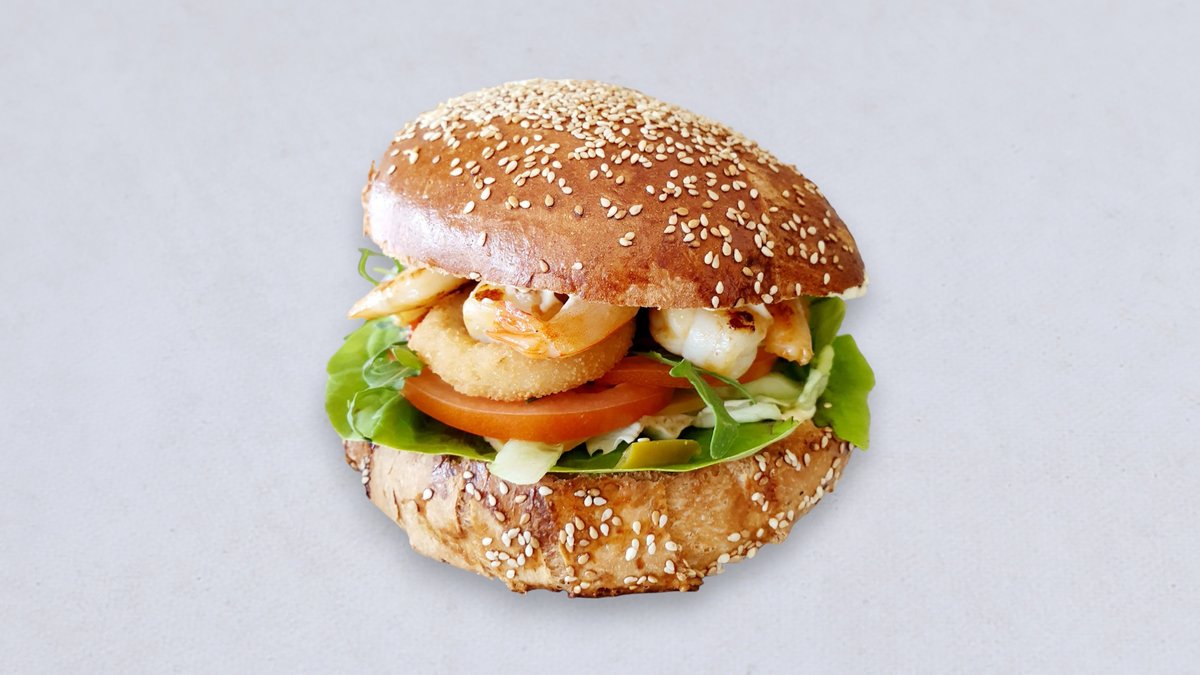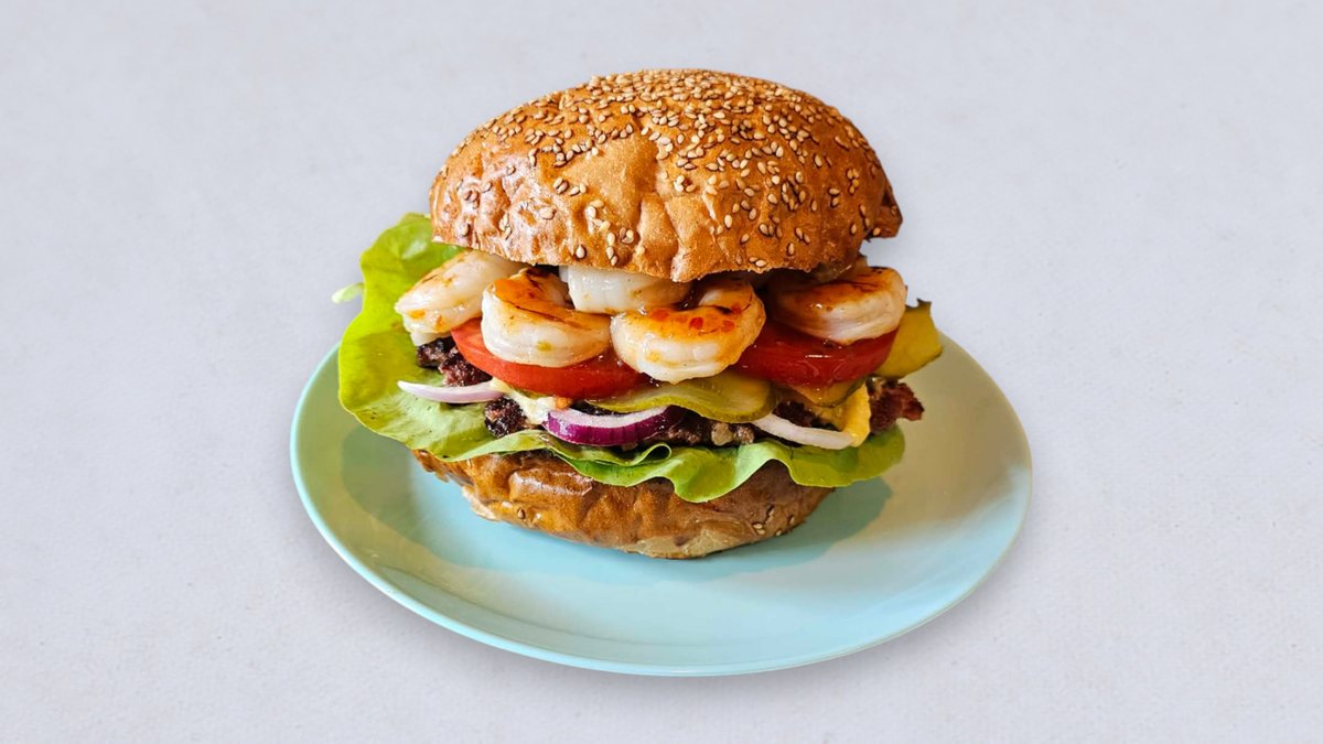Wołowina, 8 szt. krewetek, podwójny ser cheddar, pomidor, ogórek konserwowy, cebula czerwona, sałata, sos do wyboru