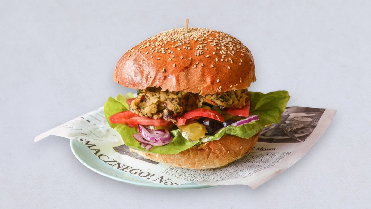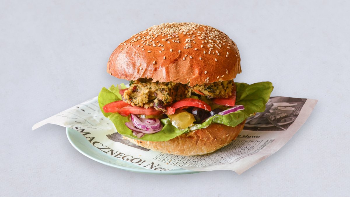 Z kotletem warzywnym naszej własnej produkcji, sałatą, świeżym ogórkiem, papryką, cebulą czerwoną, pomidorem i sosem do wyboru
