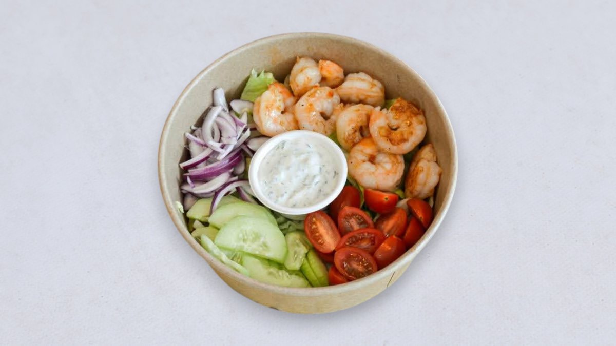8 szt. krewetek, ser favita, pomidor, ogórek świeży, rukola, cebula, sałata, papryka świeża, vinaigrette, sos do wyboru, polecamy słodkie łagodne chili oraz sos czosnkowy