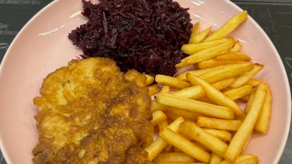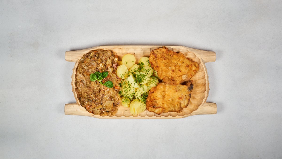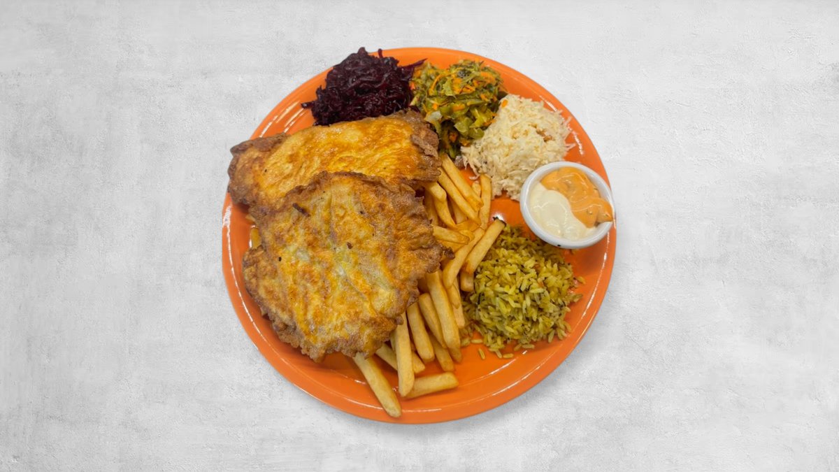 250 g. Kotlet ze schabu, 2 jajka sadzone, 2x sos, 3x surówki, frytki