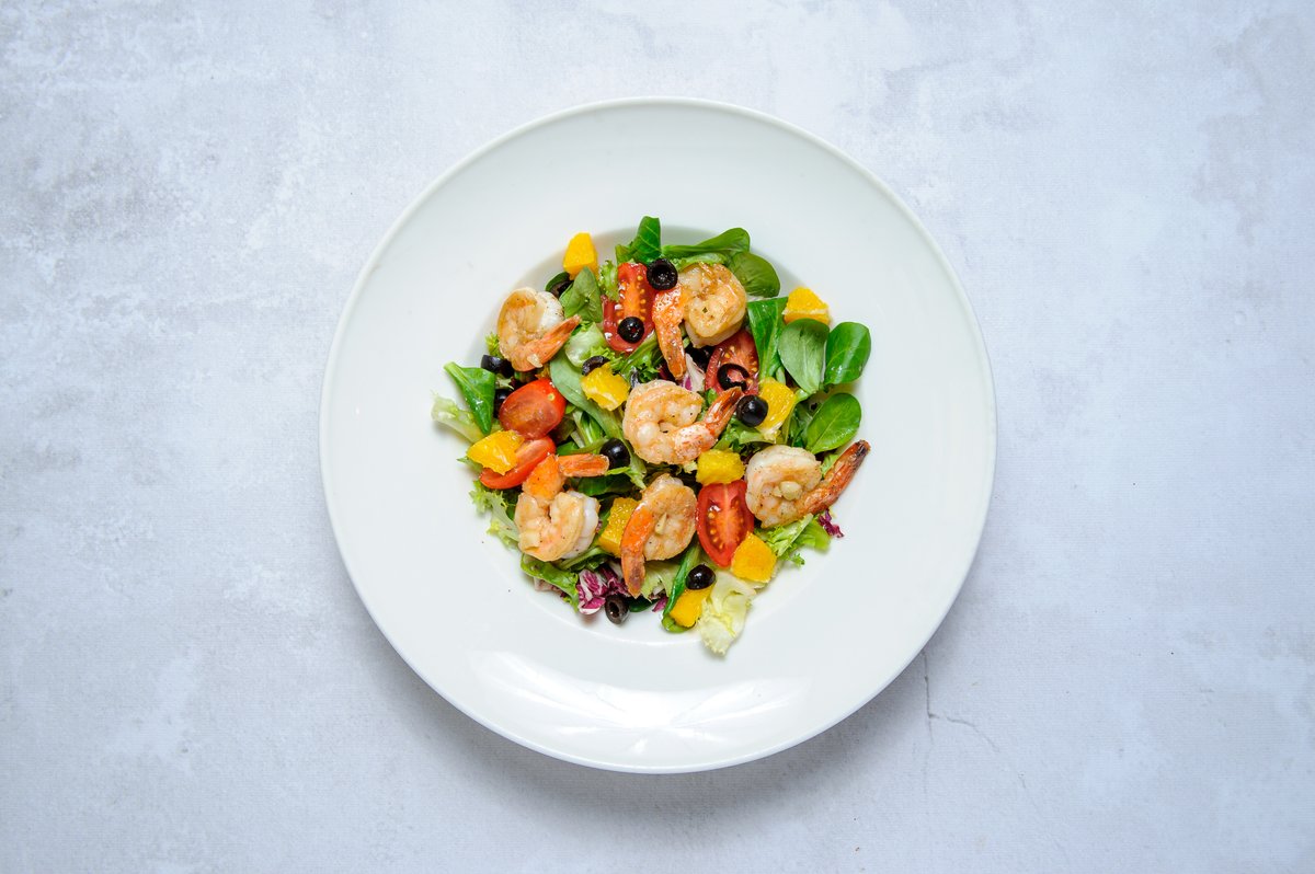 Mix sałat, 5 x krewetki, ogórek, pomidor, papryka, cebula, sos vinegret. Zdjęcie poglądowe