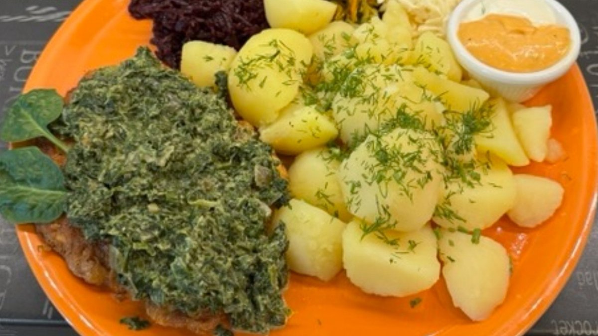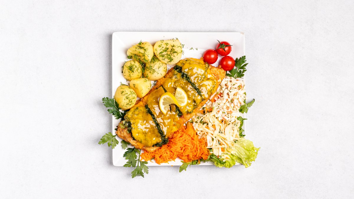250 g Filet z dorsza, ziemniaki, szpinak, 3 x surówka. Zdjęcie poglądowe