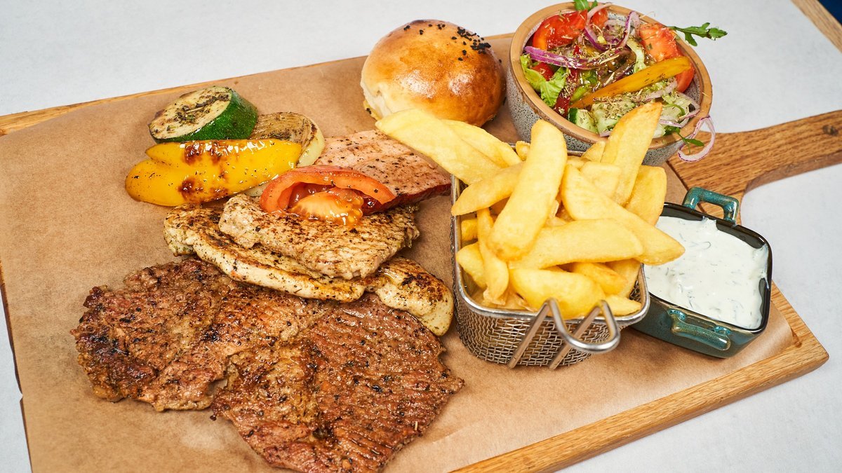250 g. Mięso drobiowe, frytki, sos tzatziki, sałatka grecka
