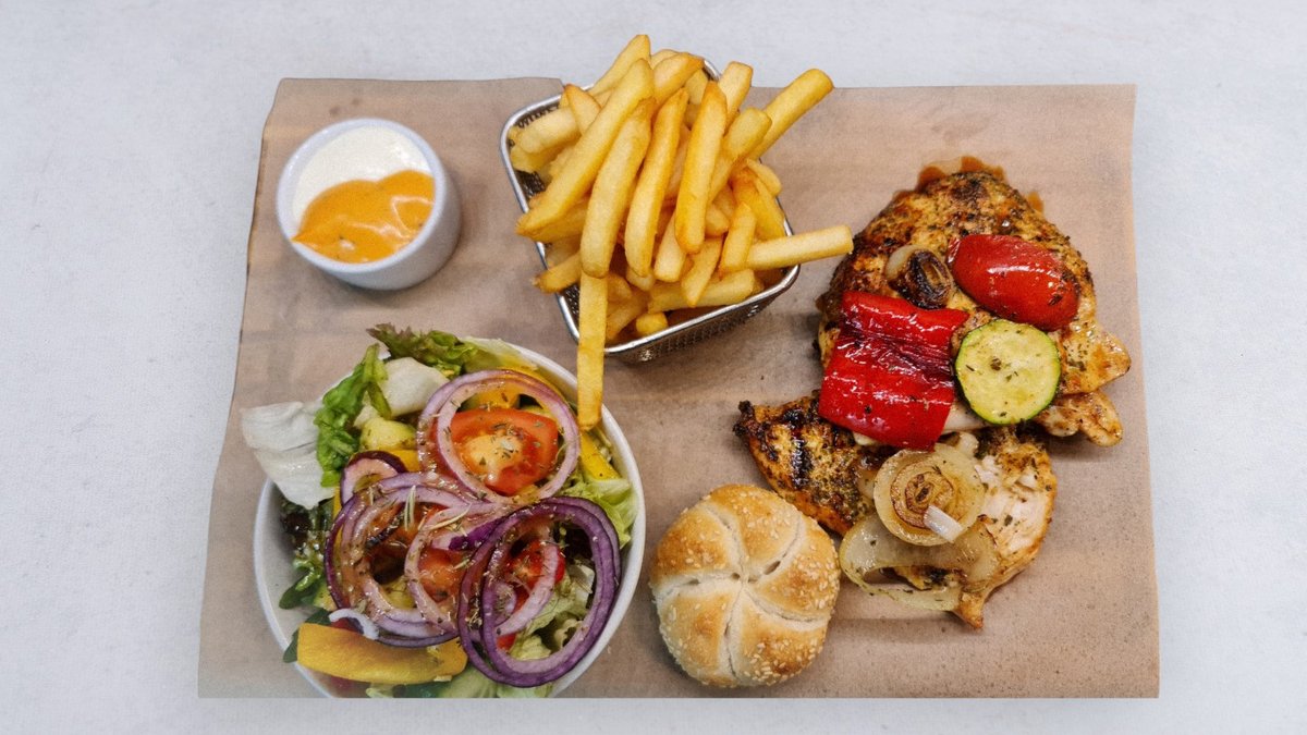280 g. 2x pierś z kurczaka, 2x sos, 3x surówki, frytki i ryż