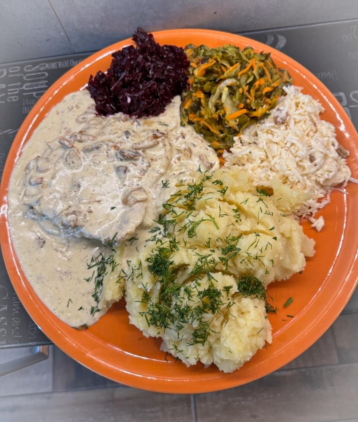 650 g. Placek ziemniaczany, gulasz węgierski, 3x surówki